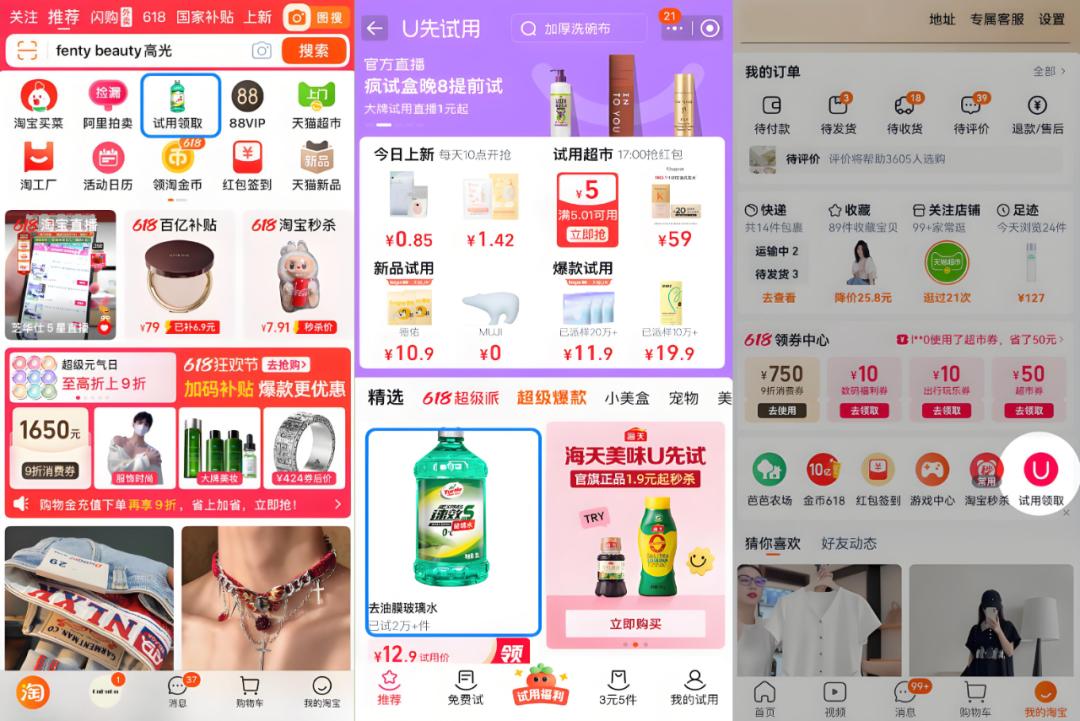 有資深的 淘寶用户 ,在今年6 18 剛 開始時就發現, 手機 淘寶 A PP內 “試用 領取” 的 入口變多了 。除了 首頁頂部 與 百億補貼、天貓超市等王牌欄目並列的“ 黃金 位置” , 在 一級 頁面“ 我 的淘寶” 內 也有 固定 的 入口 存在 。 “ 第一次體驗後有點 後悔沒 早 一些發現 這個 玩法” ,這是多數人嚐鮮後的真實反饋。