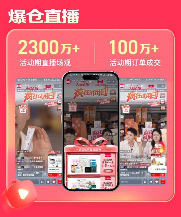天貓U先的官方直播間多年來積累坐擁超8100萬粉絲,位列淘內前三,日均觀看、最高在線等數據皆又創新高。在紮實的用户規模基礎上,日播、專場、超級頭部、達人矩陣等多種類型的直播場景被充分開發,讓品牌總可以找到適合的那一款。官方直播間在618期間,每天火力全開支持入倉派樣,還組織了爆倉主題相關活動,推動瘋狂試用日派發高峯。