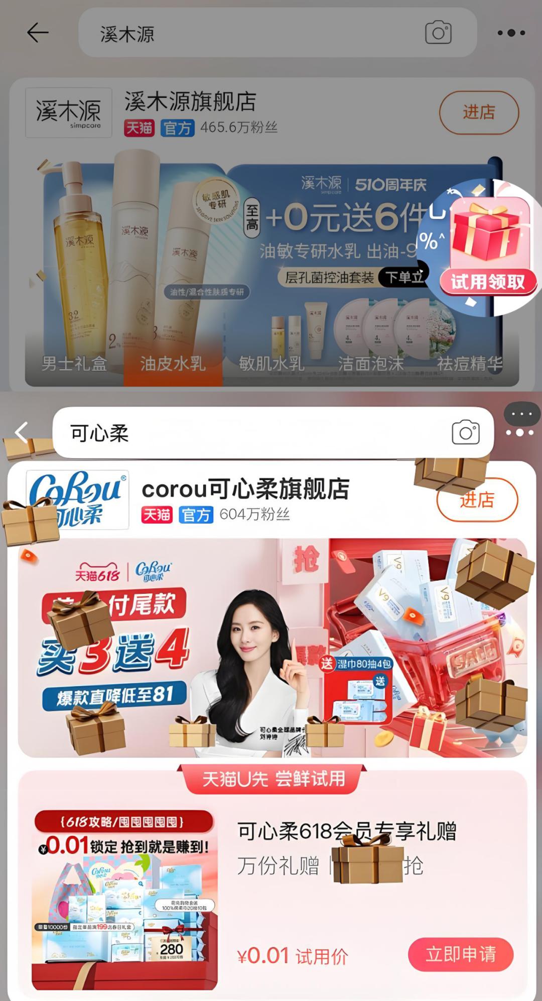在品牌側,阿里媽媽品牌專區向來是年框合作的頭部商家投放的重要陣地之一,不過消費者在大促前往往會觀望優惠。派發小樣則可以提升這個等待期的廣告流量價值,拉高促前蓄水效率。天貓U先今年首次推出的品牌專區派樣組件,能在蓄水期發揮更好的流量承接和廣告觸達作用。護膚品牌溪木源專區內的試用領取小把手組件點擊率驚人,達到了其他創意組件的1.8倍。紙巾品牌可心柔,通過互動組件派送0.01元的618會員專享禮贈,提前鎖定了數萬意向下單用户,爆發期也帶來數百萬回購成交。