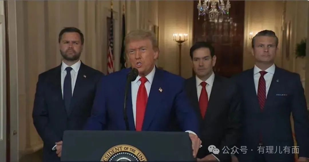 晚上22時,特朗普在白宮發表全國講話表示,美國的目標是“摧毀伊朗的核濃縮能力”,這次行動取得了“輝煌的軍事成功”。他還稱,伊朗的主要核濃縮設施已被徹底摧毀。伊朗“要麼迎來和平,要麼將面臨比過去8天更大的悲劇”,如果和平不能到來,美國還將打擊伊朗的其他目標。