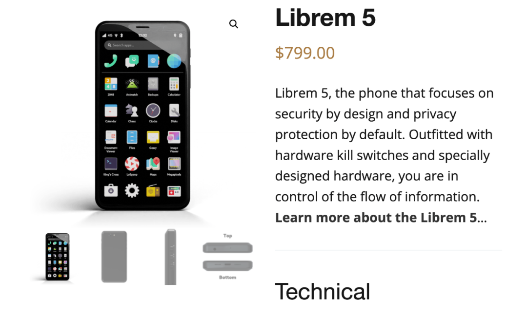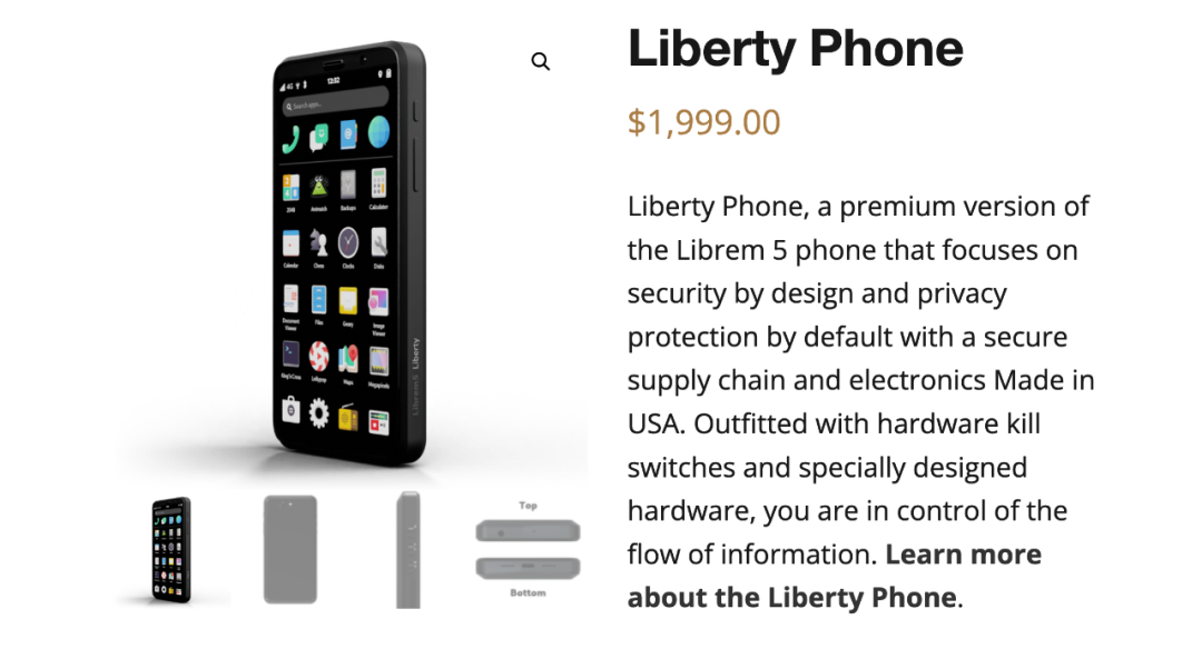 在Liberty Phone的官網中,有兩個不同版本的Librem 5手機,其中一款是普通款,中國製造,售價為799美元;另一款是美國製造,售價為1999美元。