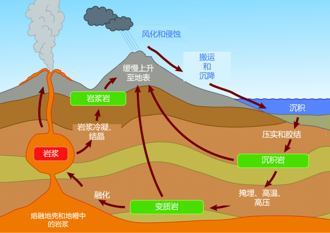 在板塊交界處,一塊板塊俯衝到另一塊下方,岩石沒入地幔中,在高温高壓下融化,變成地下的岩漿,又隨着岩漿活動湧出地表,形成岩漿岩。陸地上堅固的岩石也會隨着長年累月的風雨侵蝕變成碎石和沙土,然後這些碎屑又再次經過成千上萬年的沉積,變為沉積岩。一些被深埋在地下的岩石互相摩擦、擠壓,成為變質岩。