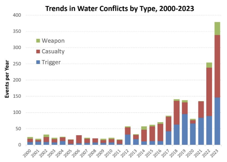 近年來,全球圍繞水資源的暴力衝突顯著上升。數百年來已有1900多起與水資源相關的武裝衝突,其中近九成發生在21世紀。尤其是2012至2021年間,衝突事件數量是2000至2011年的四倍,2023年又比前一年增加了50%。國家間的跨境水資源衝突也呈激增趨勢,過去合作多於衝突的格局正在被打破,自2017年以來,衝突已超過合作事件。許多現代戰爭更將水資源作為武器或目標,從中東到烏克蘭,再到加沙,水系統頻繁被蓄意摧毀或控制,導致生態破壞和公共健康危機(來源:CSIS)