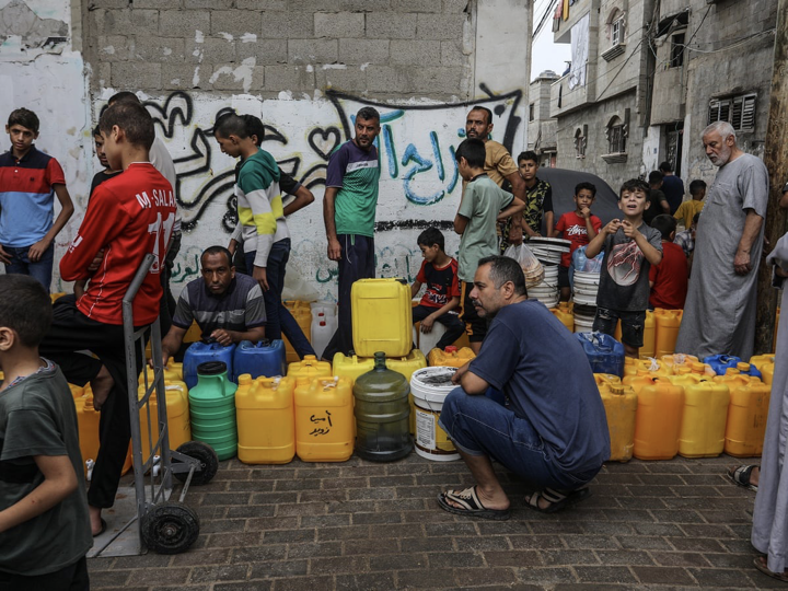 加沙地區95%人口缺乏潔淨飲用水,污染水源和鹽化地下水正在引發嚴重健康危機。聯合國警告稱,脱水可能導致兒童死亡。由於以色列對水電供應的限制,水資源日益稀缺,人們排隊取水的場景已隨處可見(圖源:The Guardian)