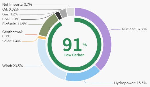 根據芬蘭電網的能源結構,截至 2024 年,芬蘭有 91% 的電力來自低碳能源。從下圖可以看出,太陽能,風能,水電,地熱一共佔了 41.5%,核能佔 37.7%。