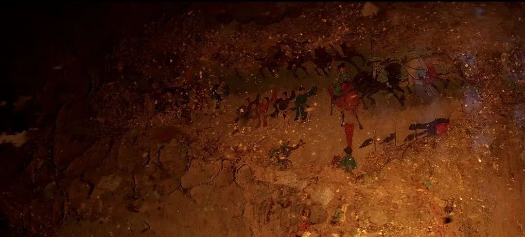 加上幾乎是把敦煌意象的飛檐重樓和拱頂石窟寫在臉上,片尾莫高窟的壁畫上直接抖落下來《張議潮出行圖》,灰塵與光影配合琵琶和鼓樂,畫面與聲音的結合,傳達意圖是明確而到位的。