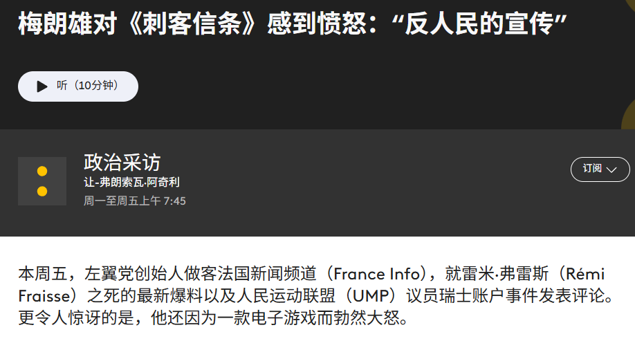 我想起來一個很有趣的例子。《刺客信條:大革命》發售時,法國左翼政治家(同時也是後來的法國總統候選人)梅朗雄曾直接在廣播節目中對這款遊戲開炮,稱其諸多細節不符合史實,是“反人民的宣傳”。