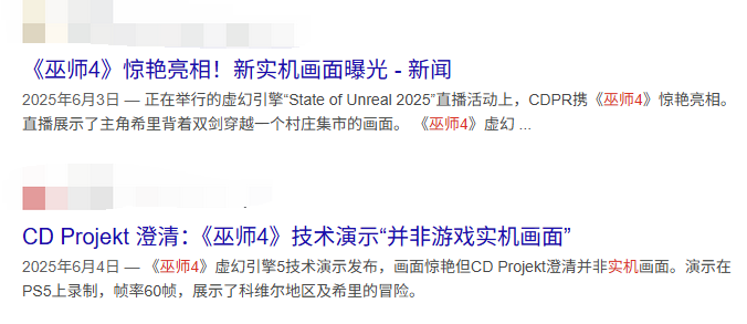 比如前段時間,《巫師4》在虛幻引擎開放日發佈了一支新演示,當時CDPR在給我的媒體郵件中強調了很多次,這是引擎技術演示(In-engine footage),而非實機畫面。但實際在很多媒體和玩家的傳播過程中,這段視頻依然被描述成了“巫師4遊戲實機畫面”。