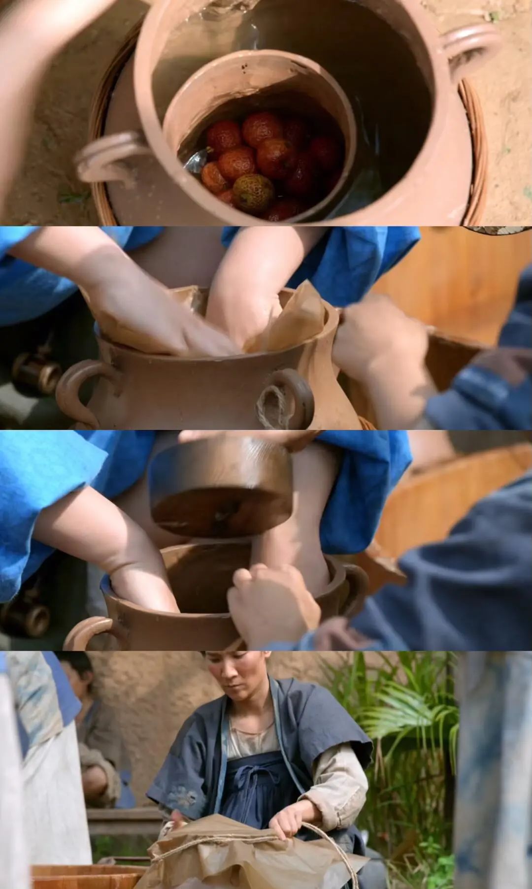 胡商又為李善德提供了一種黑科技:雙層甕。這種瓦罐分為內外兩層,外層可以加水,保持低温。鹽水洗過的荔枝放在內層,這樣荔枝既可以借用水來降温,又不會被水泡爛。