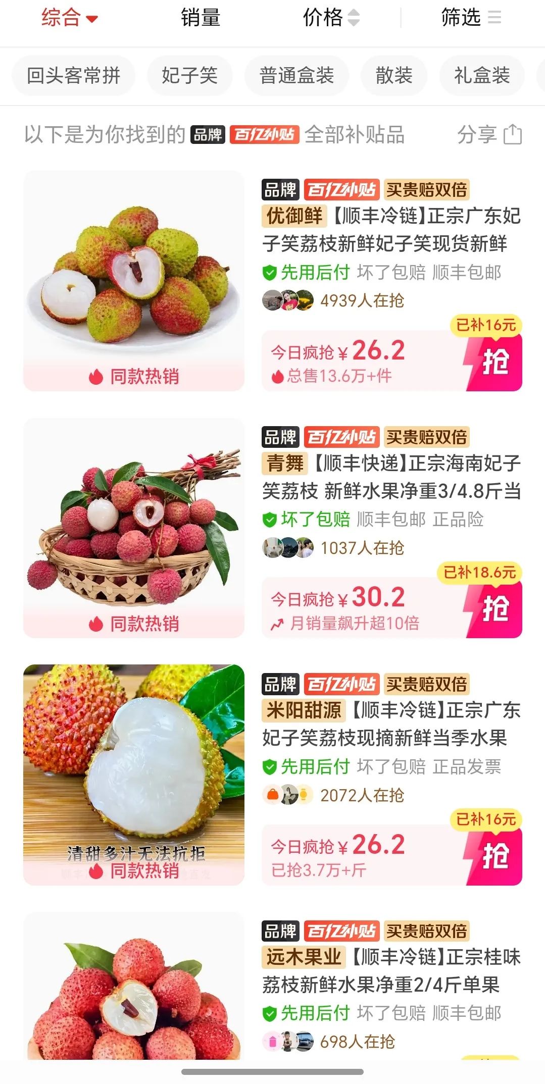 保鮮只是最基礎的要求。眼下,單果重量低於18克的妃子笑,已經無法在拼多多百億補貼專區銷售,只會被貼上“次級果”的標籤。再輔以嚴格的分揀,避免藏在泡沫箱深處的以次充好。