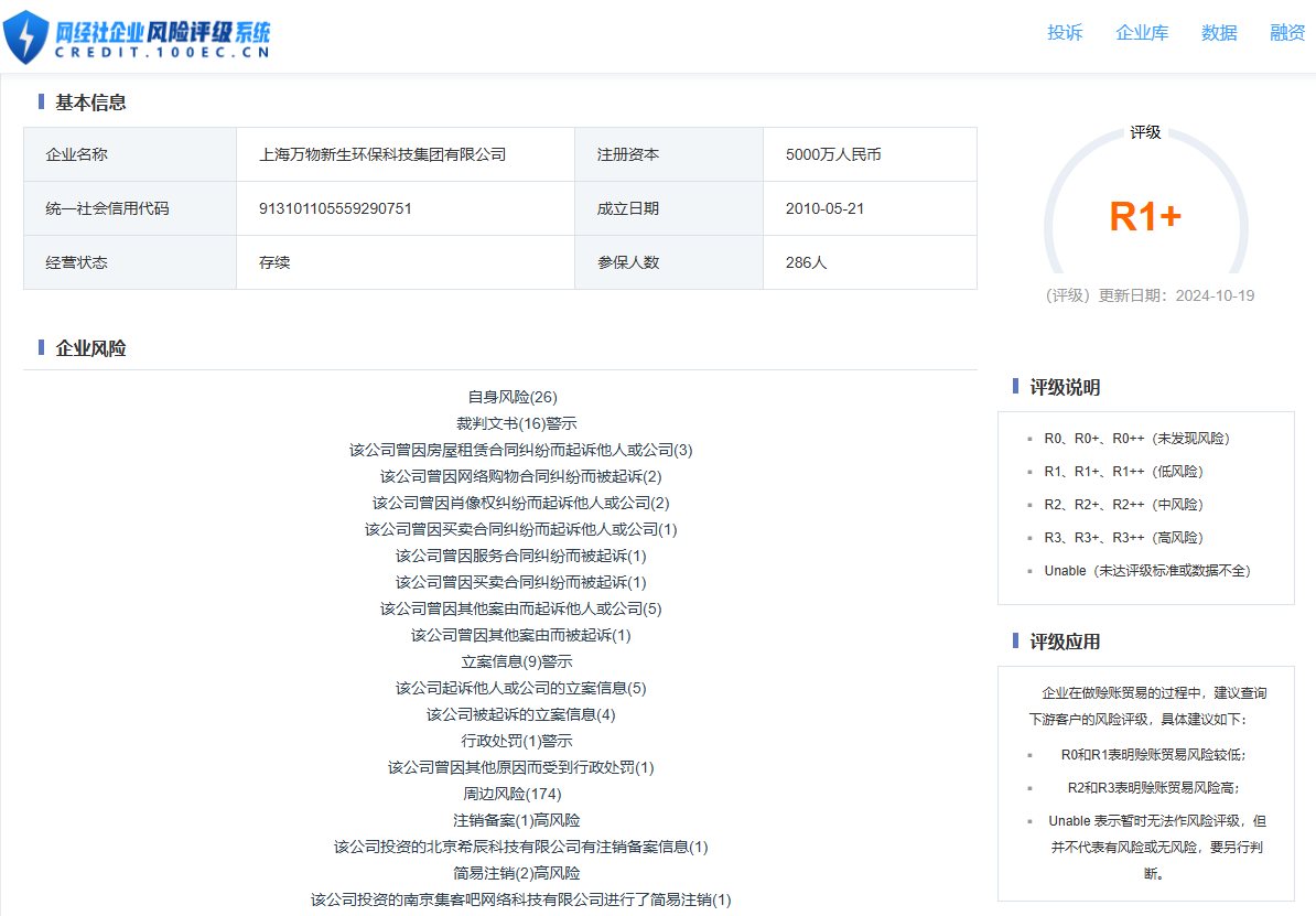 據“網經社企業風險評級系統,愛回收隸屬的上海萬物新生環保科技集團有限公司的風險評級為R1+,公司目前所處低風險。