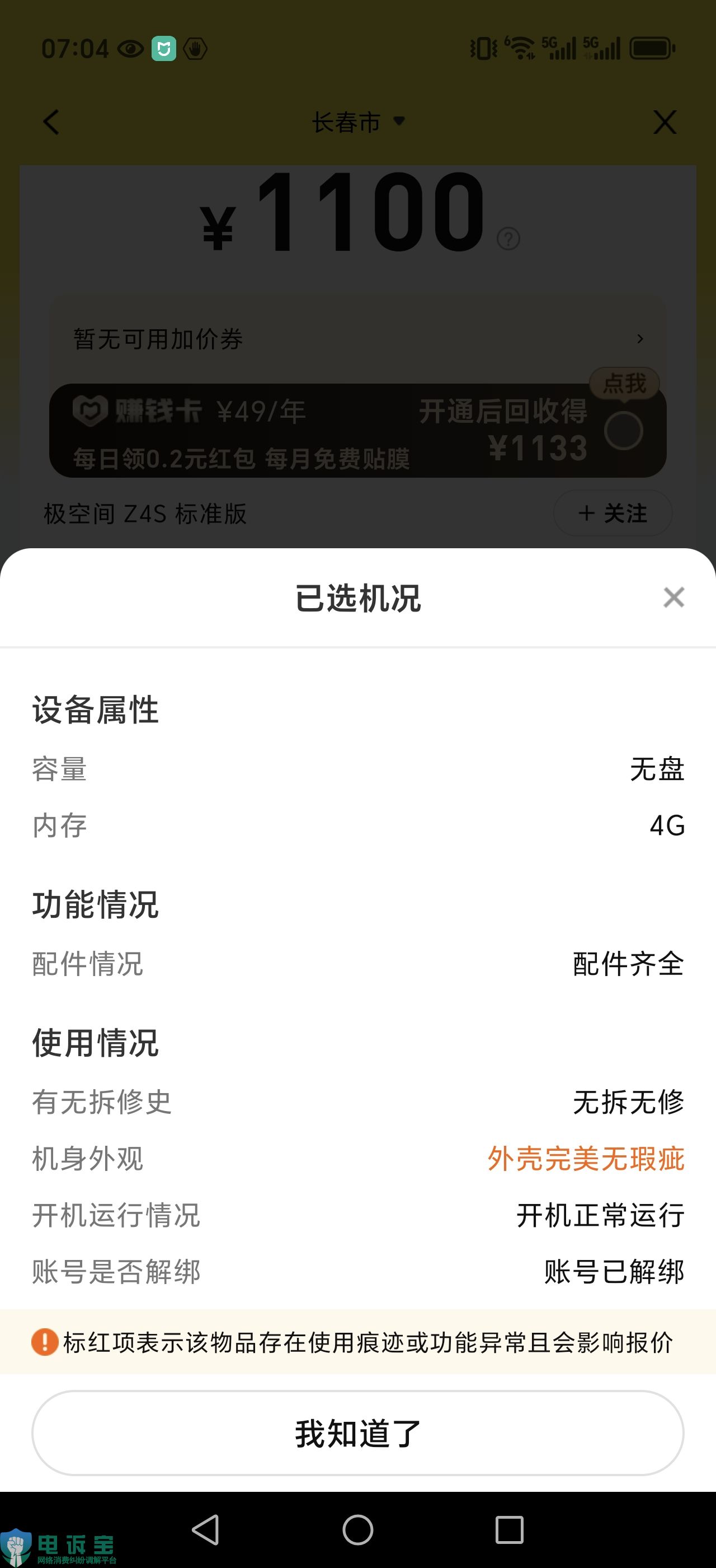 5月22日,吉林省的邱先生向“電訴寶”投訴稱其在愛回收APP提交極空間Z4S標準版(8G內存)回收訂單,因平台當時無該型號估價,遂選擇同系列1200元的旗艦版估價。
