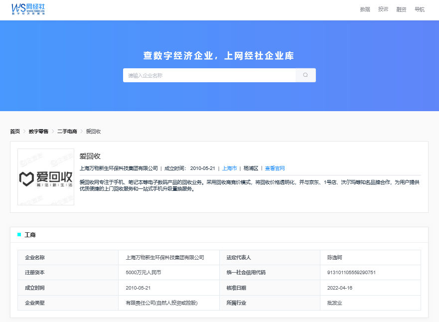 網經社企業庫顯示,愛回收隸屬於上海萬物新生環保科技集團有限公司,成立於2010年5月21日,位於上海市楊浦區,法定代表人為陳逸軻。
