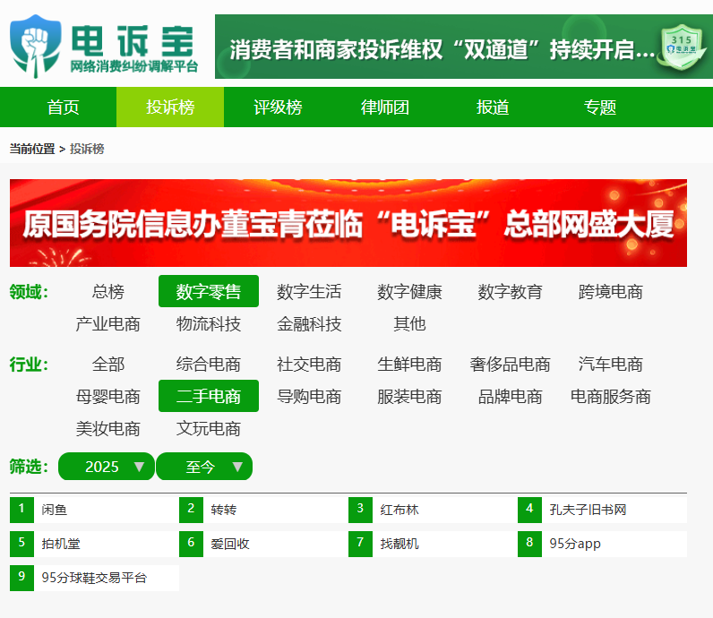 2025年至今,“電訴寶”受理投訴中涉及的二手電商領域用户有效投訴顯示(依據投訴量排行),**“愛回收”排名第6位,最新評級為“不予評級”;**其他被投訴的類似平台還有:閒魚、轉轉、紅布林、孔夫子舊書網、拍機堂、愛回收、找靚機、95分、95分球鞋交易平台等。