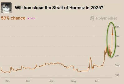 1. Polymarket賭盤,伊朗真的關閉霍爾木茲海峽的可能性已經來到了53%!這是説超過一半的錢認為伊朗真會幹。實際可能性應該比賭徒估計得小一些。