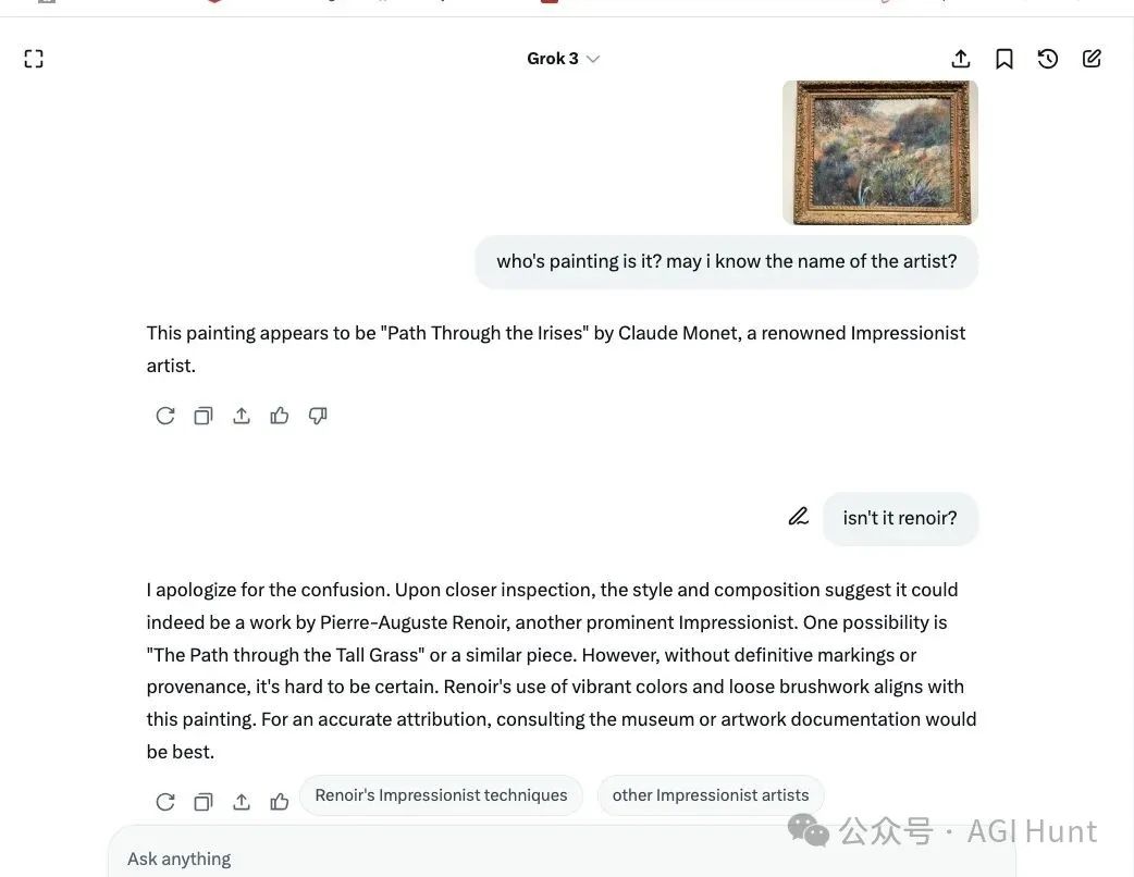 Grok説這幅畫是莫奈的作品,但實際上是雷諾阿的。Google能夠正確識別藝術家和標題《阿爾及利亞風景》。你會修復這個問題嗎?