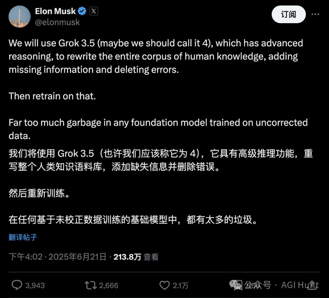 剛剛,馬斯克在X上放話:將用Grok 3.5(或許直接叫Grok 4)重寫整個人類知識庫,添加缺失信息,刪除錯誤內容,然後基於這個「純淨版」知識庫重新訓練模型。