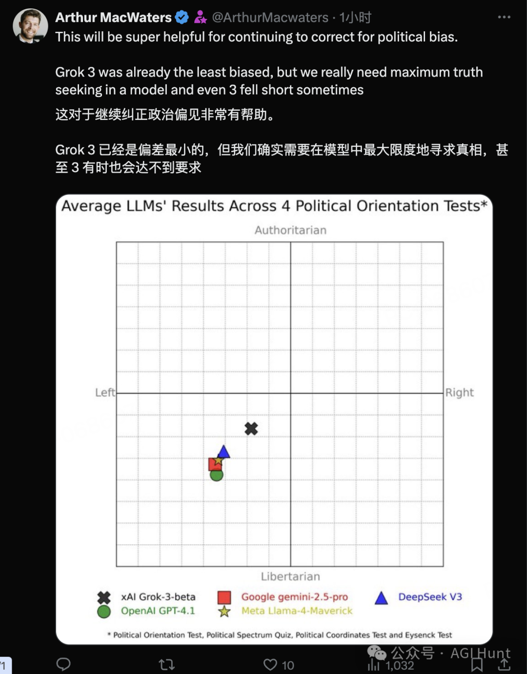有網友指出:目前Grok 3 已經是偏差最小的模型。