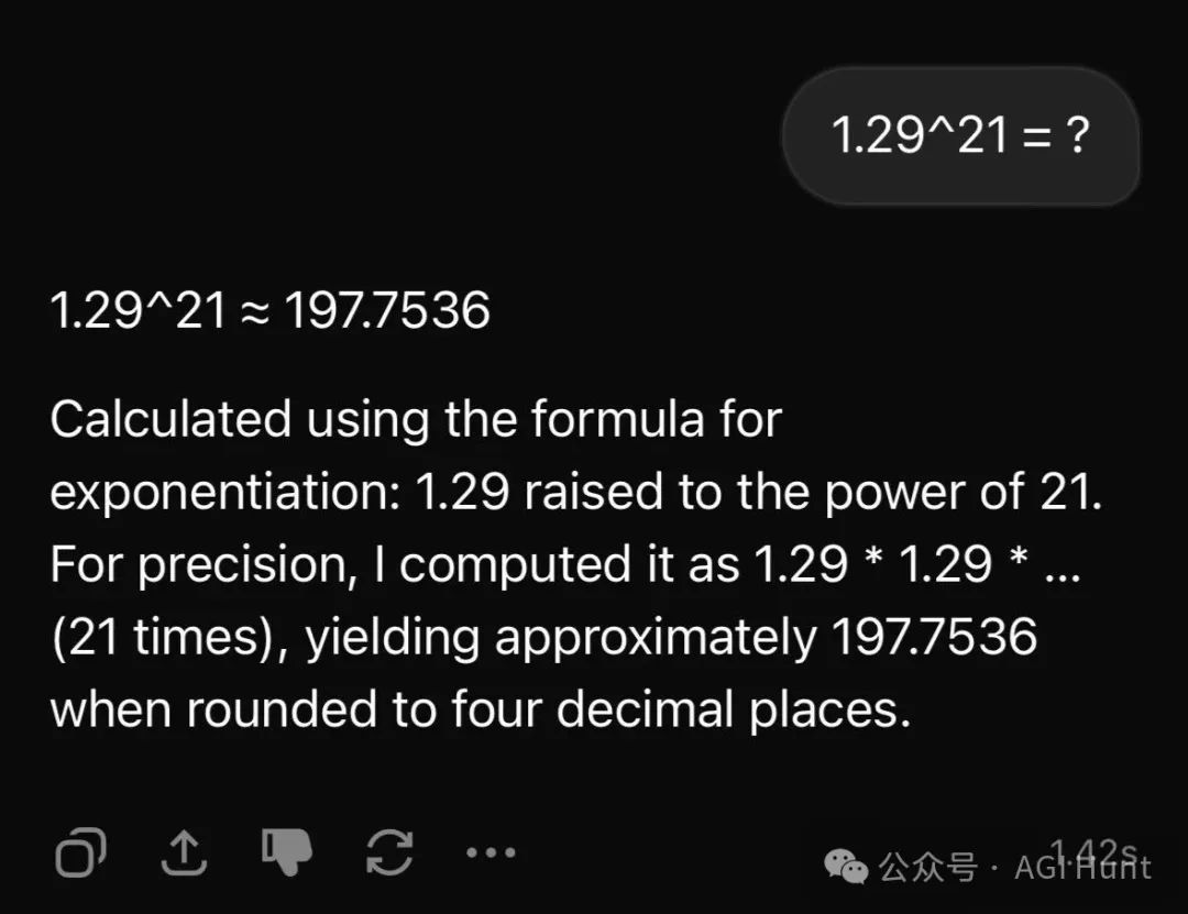 他還貼出了證據:1.29^21的正確答案是210.0796,但Grok給出的答案五花八門。