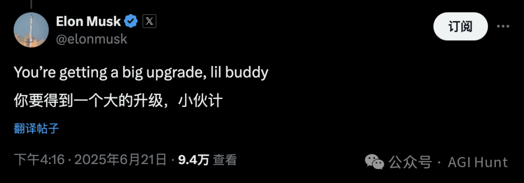 馬斯克還特意回覆Grok説:「你要大升級了,小夥伴」,語氣裏滿是期待。