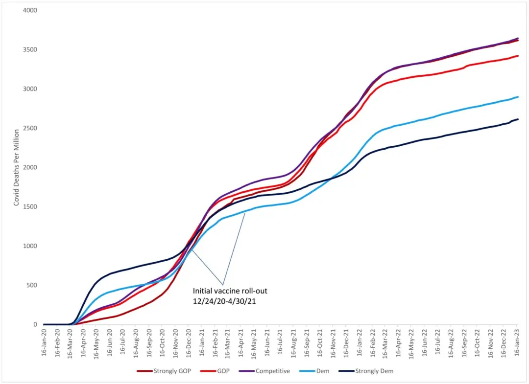 然而,在我們的分析中,政策差異並未體現在疫情結果的差異上。重新開放並未引發病毒的立即反彈。 截至2021年4月——此時疫苗已向所有成年人開放,各地限制措施已放鬆——共和黨州和民主黨州在疫情政策上已保持了近一年的顯著差異,但兩者的人均死亡率幾乎沒有差異。(見下文圖2。)這一事實——可輕易從疾控中心數據中看出——似乎並未引發主流媒體的深入反思。採取截然不同限制措施的州長們紛紛為“工作做得很好”自詡,獲得公眾支持,並以高票率連任。共和黨州和民主黨州在發病率和死亡率上最終出現分化,但僅在疫苗接種全面展開後才發生。截至2023年1月,疫苗接種率較低的共和黨傾向州死亡率比民主黨傾向州高出近30%。
