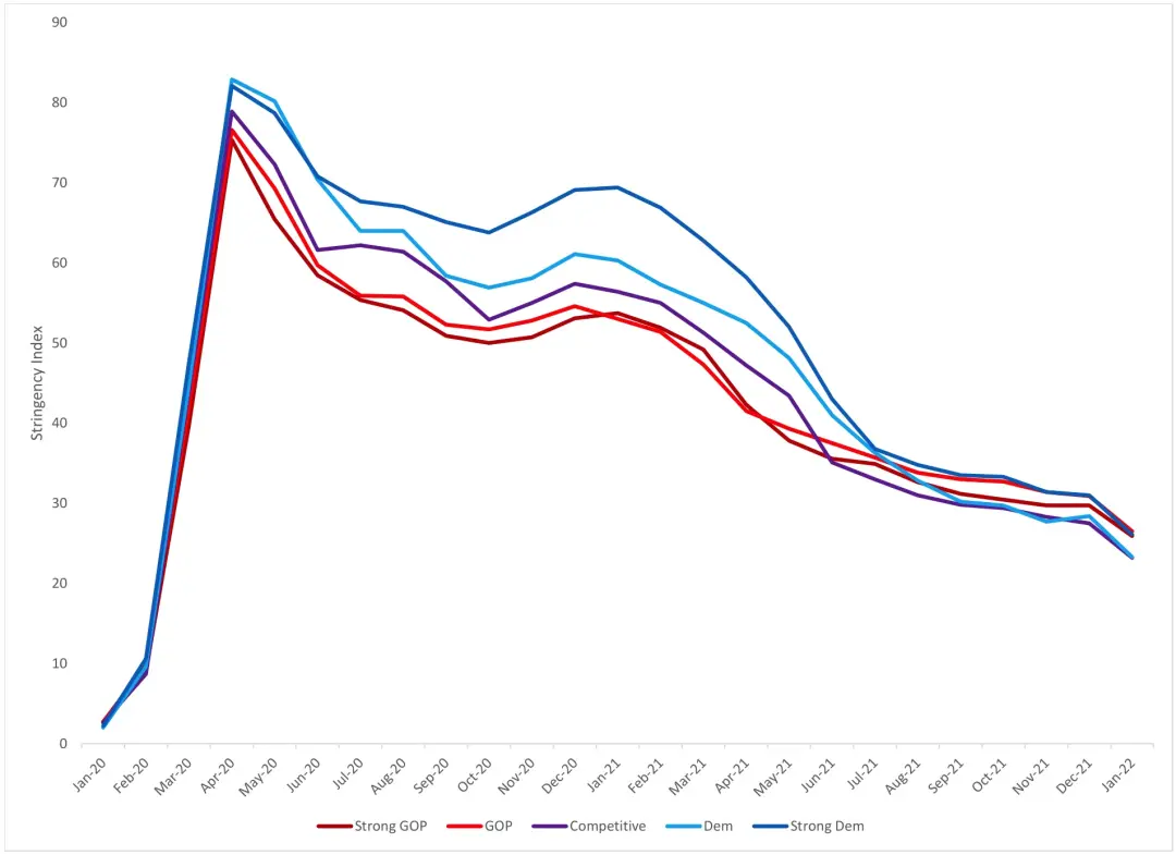 在疫情最嚴重的階段(2020年3月至2021年7月),民主黨州實施的疫情限制措施始終比共和黨州更為嚴格。我們採用牛津大學廣泛使用的嚴格程度指數(包含9個指標,包括學校和工作場所關閉、旅行禁令等),對各州每月限制措施的嚴格程度進行評估,時間範圍為2020年1月至2022年1月。(見下圖1。)政策對變化的調整力度有限。儘管疫情浪潮此起彼伏,但政策仍沿黨派分界線劃分,民主黨州在2021年夏季前一直保持比共和黨州更嚴格的限制措施。