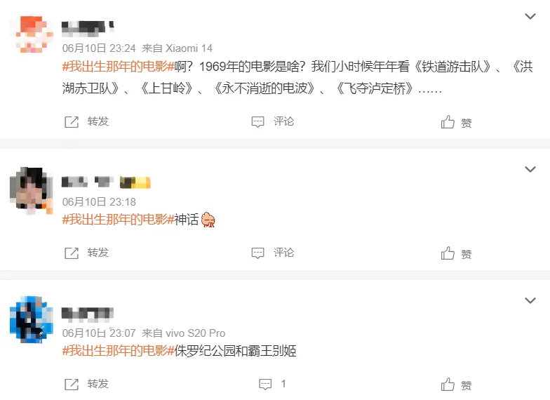在2025微博電影之夜上,許多電影人在上台致辭時,都提到了對中國電影120週年的感悟。在線上,通過微博電影策劃的#我出生那年的電影#活動,不少觀眾也分享了自己與電影的故事。有1969年的用户想起了小時候看的《鐵道游擊隊》《飛奪瀘定橋》,有1994年出生的用户自豪地列出了當年的經典影片片單。