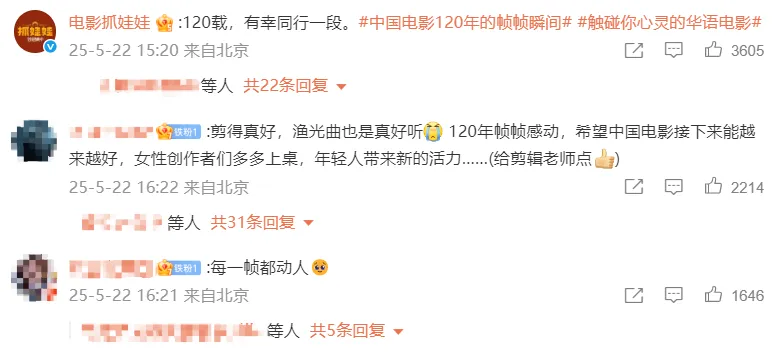 短片一發出,就被《哪吒之魔童鬧海》《少年的你》《無名》《河邊的錯誤》等影片官微接力轉發,張藝謀、賈樟柯、章子怡、張小斐等影人/工作室也轉發分享。觀眾也同樣收穫了廣泛共鳴,短片收穫破億播放量,話題閲讀量超9200萬。不少網友在評論區感慨“120年幀幀感動,希望中國電影接下來能越來越好”“每一幀都動人”。