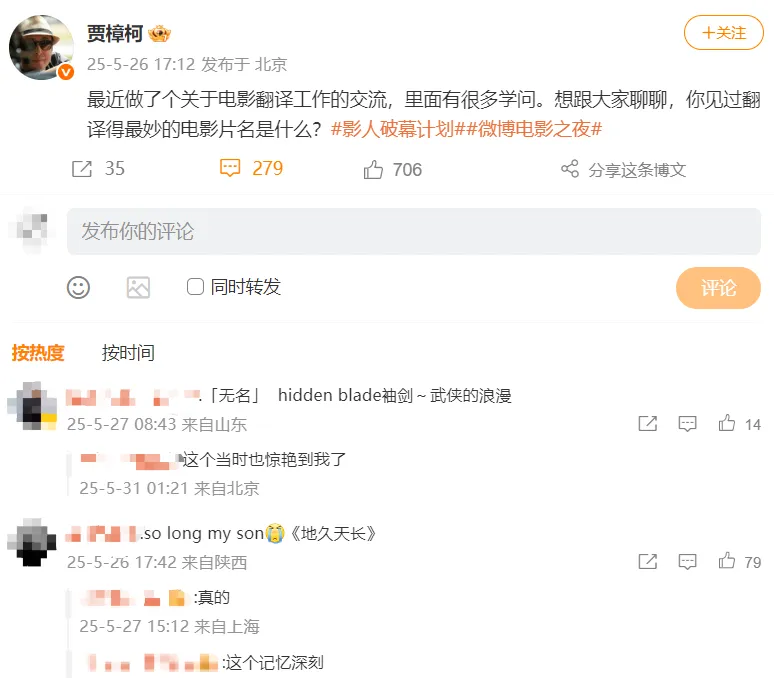 在微博上,也的確時時呈現着電影人與觀眾們密切交流的熱鬧景象——賈樟柯導演和影迷熱烈探討着哪部電影的英文片名翻譯得最妙,易小星在網友評論中搜集着人生喜劇系列新片的靈感,孫陽和大家討論那些年N刷的電影……在近期微博策劃的“影人面對面”活動中,共計40+影人及官微發博提問,吸引了微博網友的積極參與。該活動相關視頻播放量超100萬,“特邀影迷”董子健、李夢、孫陽助陣,共計登上熱搜榜6次,相關話題閲讀量超4800萬。