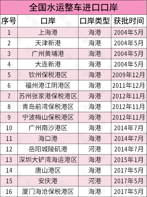 有滾裝碼頭不代表就可以開展整車進口業務,2004年起實施的《汽車產業發展政策》指定了我國首批7個整車進口口岸,可開展從國外進口汽車整體業務,首批4個海港口岸即上海港、天津新港、廣州黃埔港、大連新港。目前,全國有31個整車進口口岸,其中水運(海港、河港)口岸16個,基本上是一省一個口岸,分佈在沿海、沿江省份。