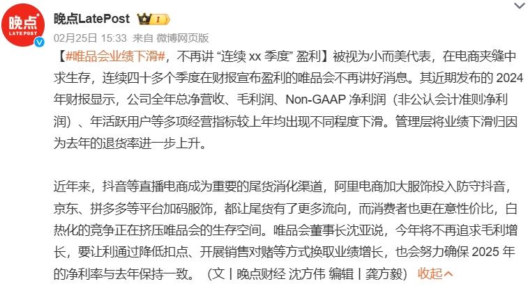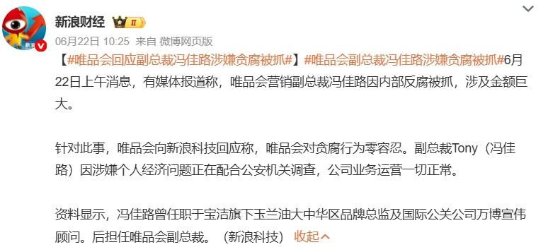 2025年6月22日,就外界傳説的沸沸揚揚的“分管品牌和營銷的副總裁馮佳路因內部貪腐問題被警察帶走”一事,唯品會對媒體證實副總裁馮佳路(Tony)因涉嫌個人經濟問題正在配合公安機關調查。