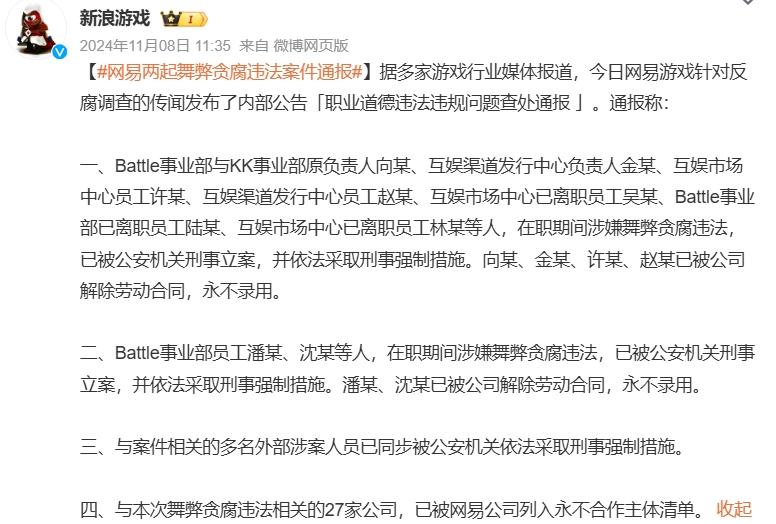 2024年11月8日,網易集團內部發布郵件通報“兩起舞弊貪腐違法案件”涉及2個事業部多名互娛高管及員工,稱“相關人員已解除勞動合同,並被公安機關刑拘,涉及的27家相關合作方被列入永不合作主體清單”。目前案件還在偵辦中,未出最終結果。
