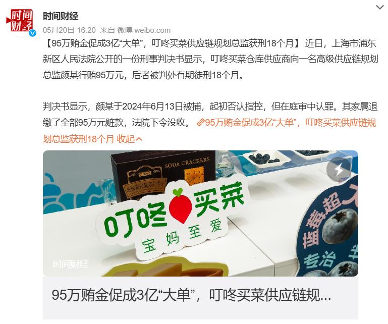 今年5月,叮咚買菜高級供應鏈規劃總監顏某,因受供應商賄賂95萬元促成3億大單,被判處有期徒刑18個月,違法所得被沒收。3年前,叮咚買菜蔬菜、水產部的相關採購負責人也都曾因受賄被法院宣判。
