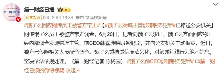 據瞭解,韓鎏今年37歲,畢業於天津大學;其曾在京東供職,2024年3月出任餓了麼首席執行官,今年2月被免去餓了麼CEO一職,改任物流負責人。餓了麼對此事件回應稱,此事是內部調查發現並主動向公安機關報案。