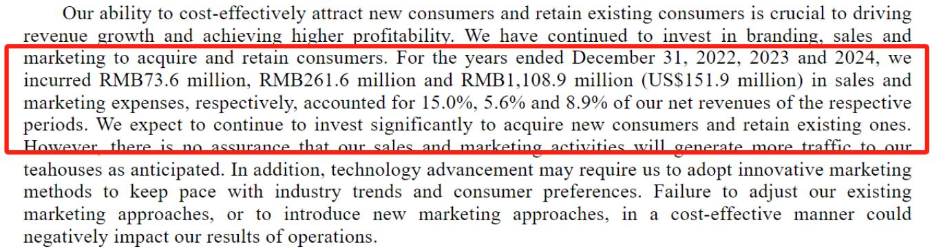 儘管新茶飲出海勢頭強勁,但發展之路並非一帆風順。成本與盈利問題成為各品牌前行的巨大阻礙。例如,霸王茶姬單店投入成本則是蜜雪冰城數倍,2022年至2024年,其營銷費用從7360萬元飆升至11億元,3年營銷費用率分別達15%、5.6%和8.9%,合計超14億元。