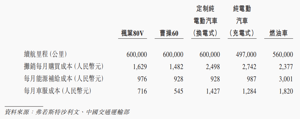 而在成本控制方面,據弗若斯特沙利文資料,楓葉80V和曹操60的 TCO (總持有成本)分別為每公里0.53元和0.47元,相比共享出行典型純電動汽車的車輛 TCO 減少32%至40%。