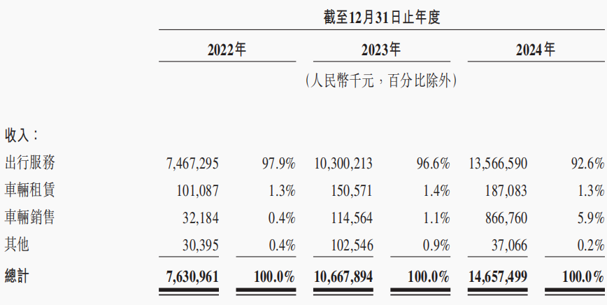 曹操出行的主要業務包括網約車、順風車等,收入主要來自出行服務。近三年,曹操出行的營收中,來自出行服務的佔比分別為97.9%、96.6%和92.5%,相應的訂單量分別為3.83億筆、4.48億筆、5.98億筆。