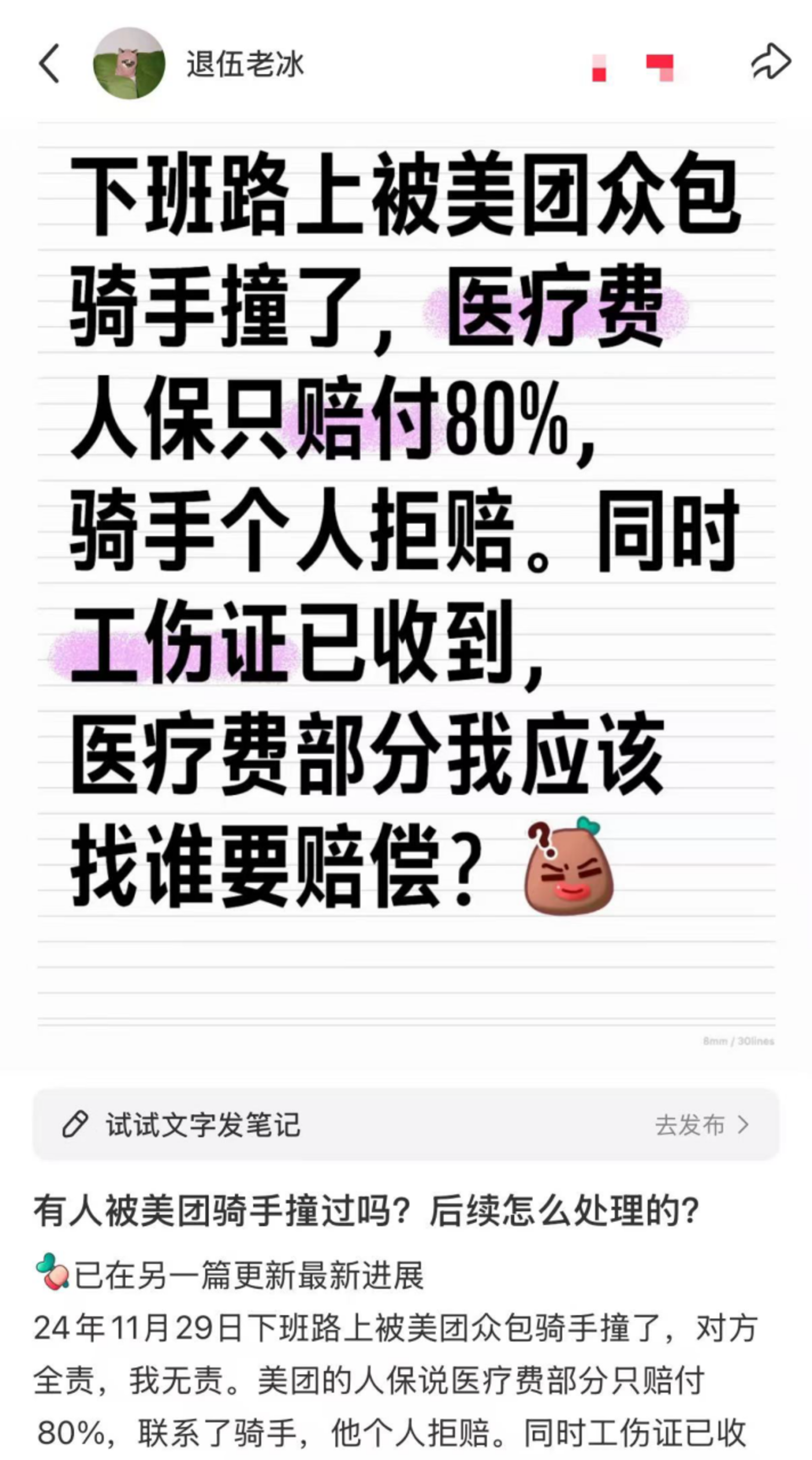 騎手在發生事故後的“一切走保險”,很有可能是被承諾過的保障,是騎手心中發生事故後的唯一應對方案,畢竟每天都能從後台看到有扣掉一份保險錢。