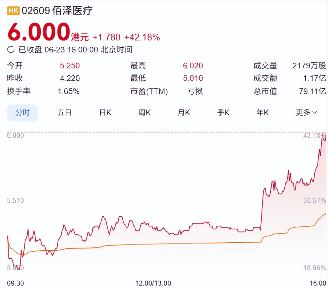 據悉,在上一交易日(6月22日)的暗盤交易中,佰澤醫療股價高開高走,收報5.37港元,漲幅達27.25%,成交額1807.46萬港元。今日上市佰澤醫療迎來了開門紅,開盤股價上漲超20%,收盤股價報6港元,暴漲42.18%,總市值達到79.11億港元。