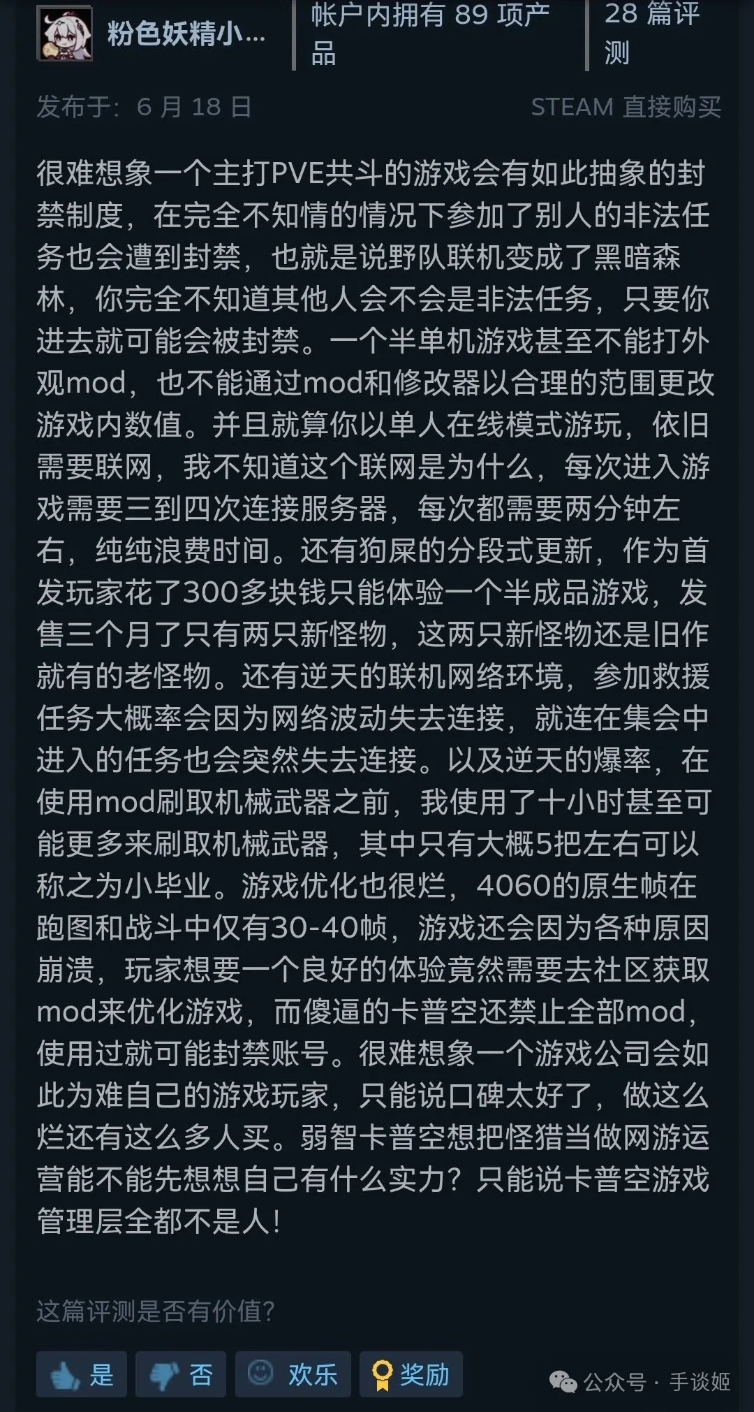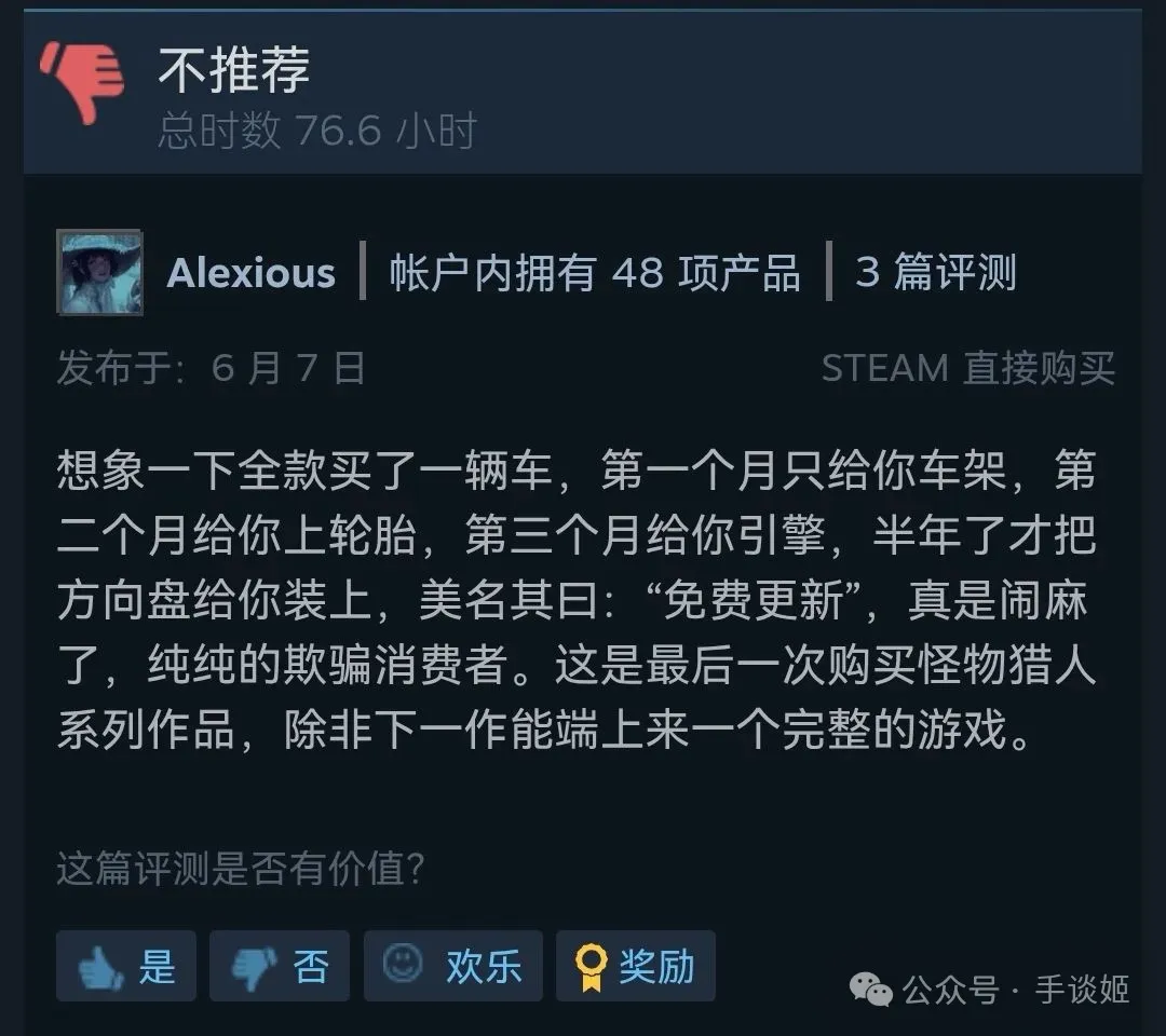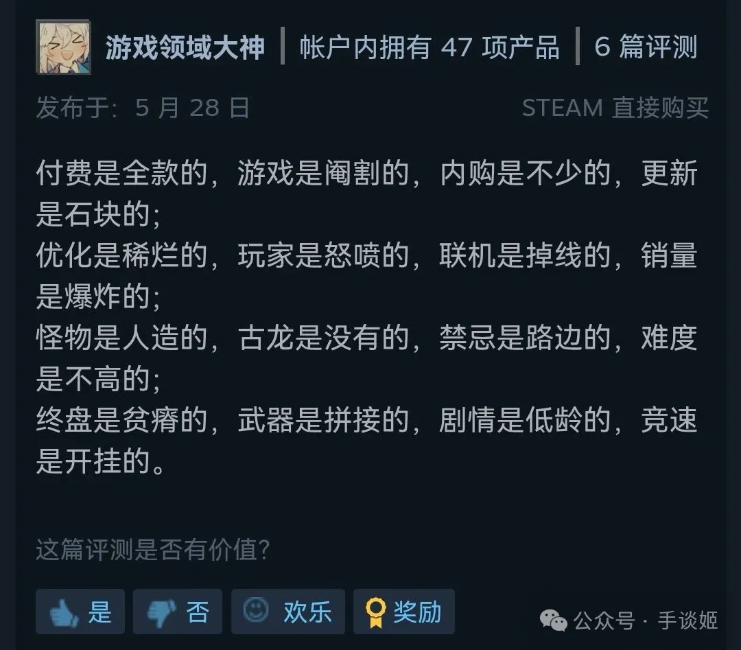 看都看了,再看看國內憤怒的玩家是怎麼噴的。有一篇非常詳盡、真·把全方位都噴了個遍的超級差評,感興趣的可以自行移步Steam差評區翻閲。