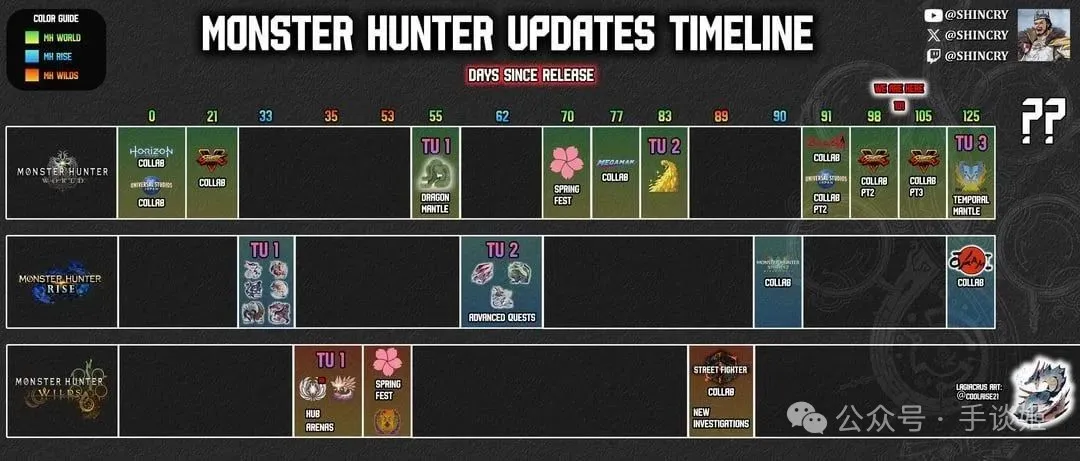 前兩部作品的名字是《怪物獵人:世界》和《怪物獵人:崛起》。世界在第一個版本就已經實裝了30只怪物,陸續更新了四個版本,再次追加6只,總計36只;崛起更加豪華,本體怪物數量和後續四個版本追加的數量加起來,達到了驚人的37+9=46只。