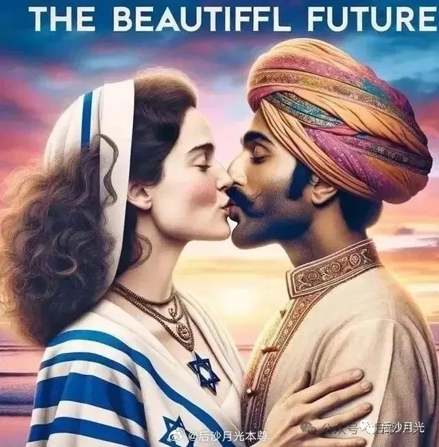 印度人當時做了不少這類圖片,以色列女子的手搭在阿三臂膀上,與他深情接吻,女人不但是主動方,還一副很享受的樣子。