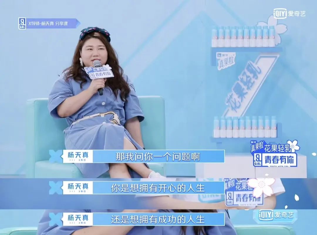 2020年,選秀節目《青春有你》第二季開播,很多如今大放異彩的女孩們,那時還處在一個迷茫的狀態裏。楊天真帶着“真理之嘴”降臨,頗像人生導師為女孩們指點迷津。