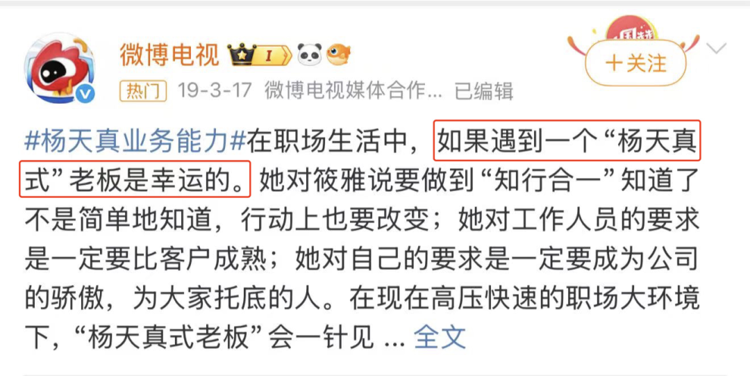 同年3月,以楊天真經紀公司為主角的真人秀《我和我的經紀人》上線,罵她的網友轉變態度,稱職場中遇到一個楊天真式的老闆是幸運的。