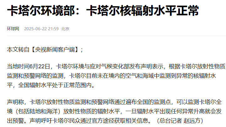 另外,在美軍轟炸伊朗核設施以後,伊朗及周邊多國表示相關傷員、周邊環境監測指標等均表明,未出現核泄漏和核污染等緊急情況。