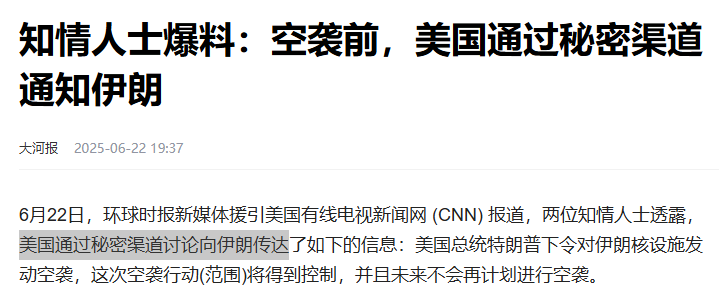 另外,6月22日,環球時報援引美國有線電視新聞網 (CNN) 報道,兩位知情人士透露,美國通過秘密渠道討論向伊朗傳達瞭如下的信息:美國總統特朗普下令對伊朗核設施發動空襲,這次空襲行動(範圍)將得到控制,並且未來不會再計劃進行空襲。