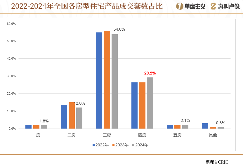 據CRIC統計,去年四房和五房產品的成交佔比持續增長