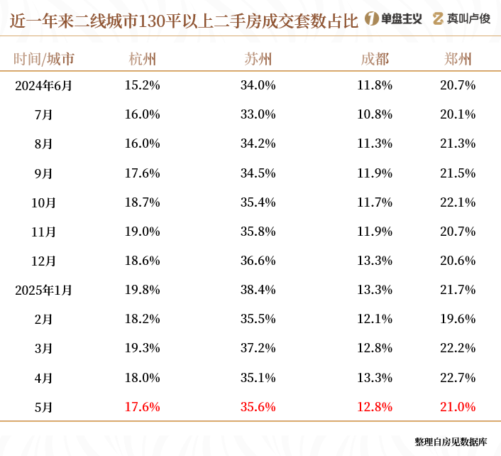 130平以上的房源成交,杭州、蘇州、成都和鄭州都有所抬頭
