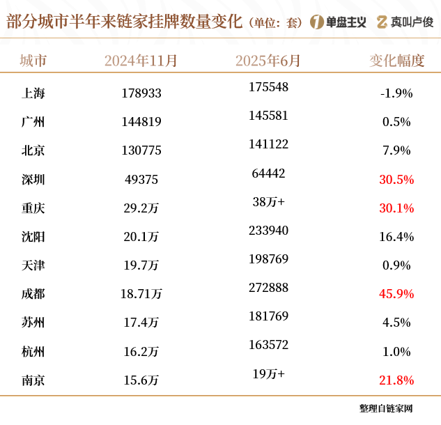 最猛的當屬成都,掛牌套數半年來增加了接近8.6萬套,幅度高達45.9%