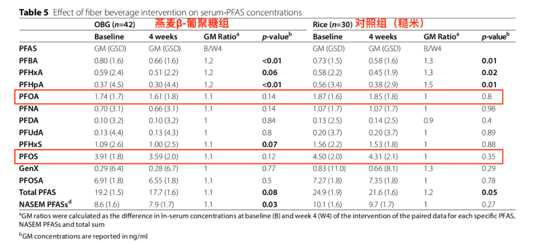 4周後發現,兩組參與者總PFAS濃度都下降了,下降幅度沒有差異,但只有燕麥β-葡聚糖組參與者中,兩種最危險的PAFS——全氟辛烷磺酸(PFOS)和全氟辛酸(PFOA)出現了顯著下降,下降了約8%